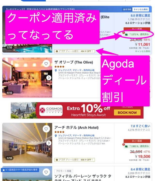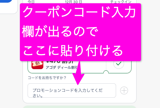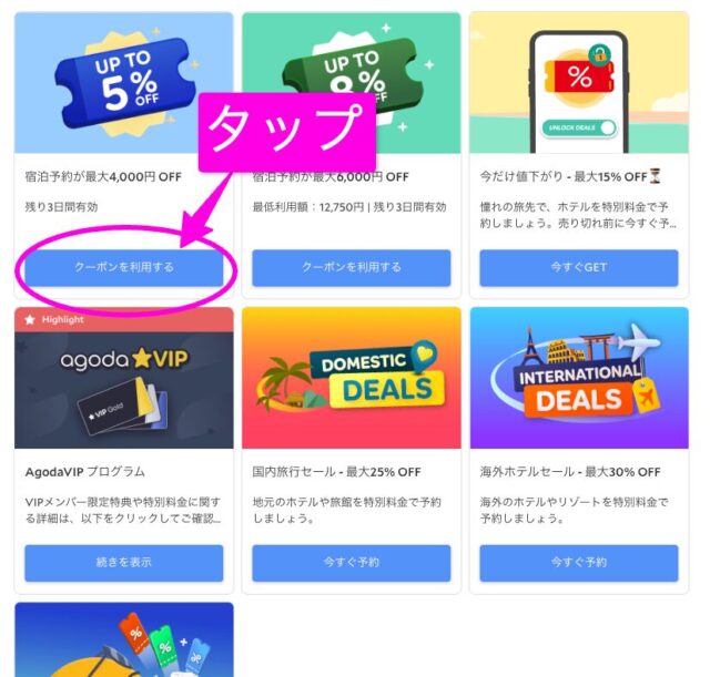 - 検索結果や部屋タイプで 「Coupon applicable(クーポン適用可)」表示がある宿・プランに切り替える (アゴダ)