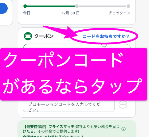 対象可否は検索結果や部屋タイプに “Coupon Applicable” の表示があるかどうかで判定する設計が多いです。