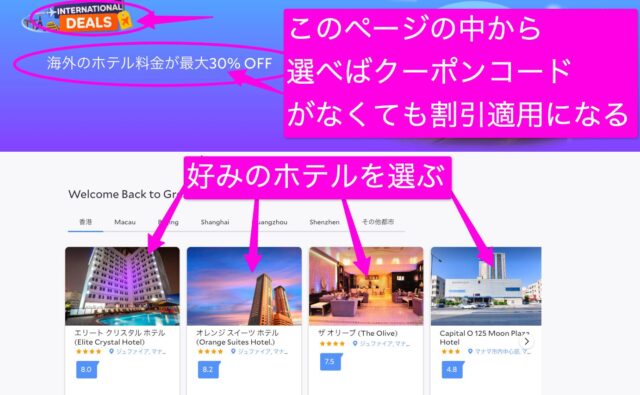 - Dealsの案内でも、「Coupon applicable」ラベルのある施設を選ぶことが前提になっています。 (アゴダ)