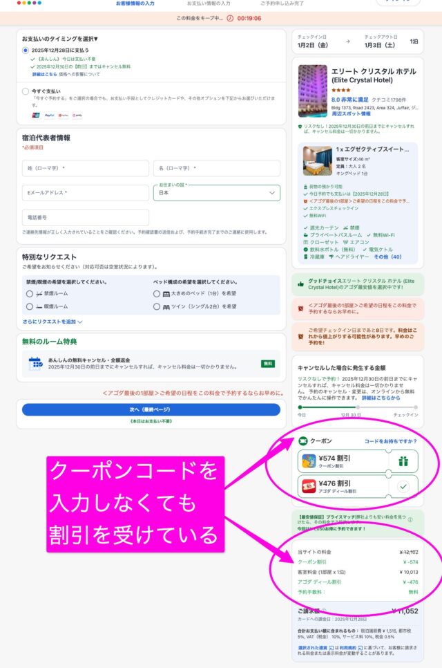 Agodaの公式ページから利用するクーポン(プロモーションコード)は、該当ページから予約することで、多くの場合自動的に割引が適用されます。