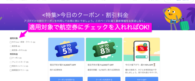 もしくはアゴダのクーポン一覧ページで適用対象の項目で、航空券にチェックを入れるという方法も。(ないこともある)