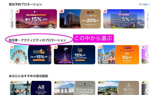 トップページの航空券・アクティビティのプロモーション欄から選んで使います。