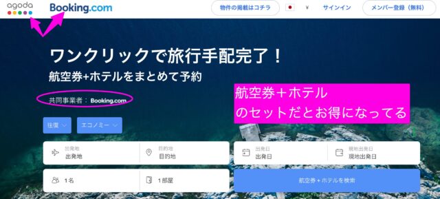 また、航空券を安く予約したい人も、共同事業者であるagodaページからクーポンを獲得して予約するか「航空券+ホテル」で予約することとなります。