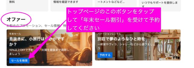 Booking.comを、キャンペーンコードがなくてもお得にするには、期間限定の「年末セール」が、誰でも割引を受けられますよ。