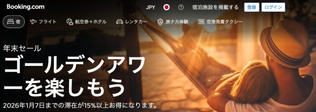 年末セールは、予約期間:〜2026年1月7日までの期間中の予約が対象です。世界中のホテルを15%割引で予約することができます。 - Booking.comスマートセール(最大30〜40%割引)