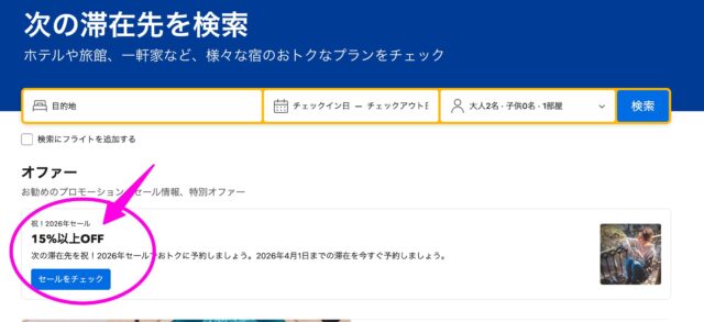 - →祝!2026年セール 宿泊施設が15%以上OFF