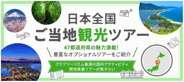 現地までの交通手段はご自身で手配して、現地で参加するツアーです。つまり現地ツアーのことですね。クラブツーリズム厳選の国内アクティビティ・現地発着ツアーを申し込むことができます。