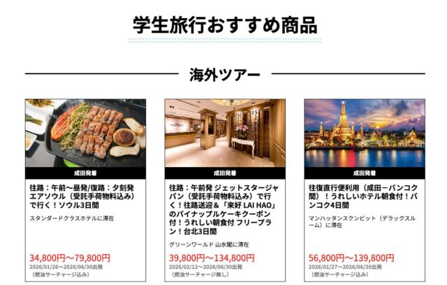 また、HISとあわせて比較したい方のために、学生旅行がお得に予約できる他社サイト も掲載。この記事を読めば、主要旅行サイトの情報を一括でチェックできるので、最適な予約先がすぐに見つかります!