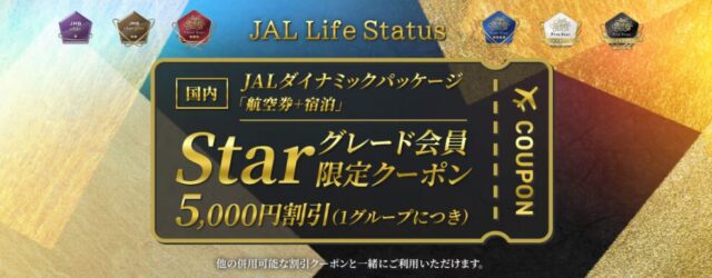 JAL Life Statusプログラムで一定のグレードに達した会員(JMB elite以上)向けに、JALダイナミックパッケージで使える5,000円割引クーポンが常時配布されています。