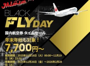 | 2025年 11月18日(火)00:00~ 11月19日(水)23:59 | 2025年12月26日(金)~ 2026年2月28日(土) | 7,700円〜 | 国内航空券 BLACK FLYDAY |