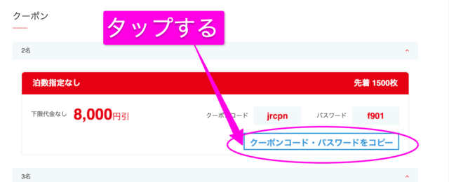 2. 「クーポンコード・パスワードをコピー」のボタンを押してコピーしておき、