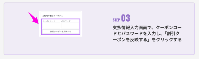 3. 申し込み手続きの支払情報入力の段階で、先程のコピーしておいた「クーポンコードとパスワード」を入力(貼り付け)すれば大丈夫です。