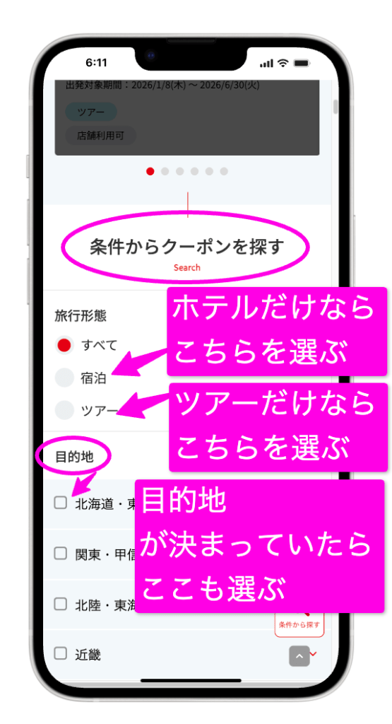 条件検索は「宿泊」or「ツアー」と、「目的地」での選択が可能です。