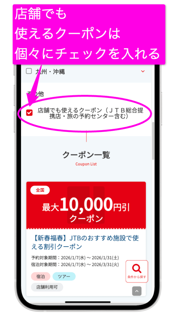 もし、店舗でも使えるクーポンを探している人は「店舗でも使えるクーポン(総合提携店・旅の予約センター含む)」にチェックを入れてください。