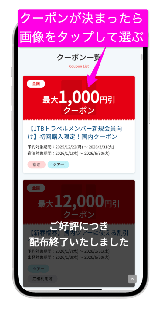JTBの会員向けに配布されるクーポンは、「ページに常に出ている」というより、会員条件を満たすと届く/付与されるクーポンです。