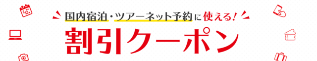 | 5%割引クーポン | 予約金額から5%OFFするタイプ ※不定期 | 例:JTBの「国内旅行・宿泊予約で使える割引クーポン特集」を見てる際に突然出現する |