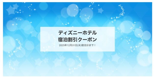 | → | ディズニーホテル ※1予約あたり最大5,000円割引 | 誰でも使える クーポンコード | 予約期間: 2025年10月17日~12月28日 宿泊期間: 2025年10月17日~12月31日 |