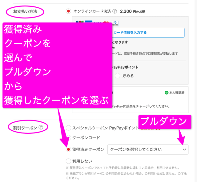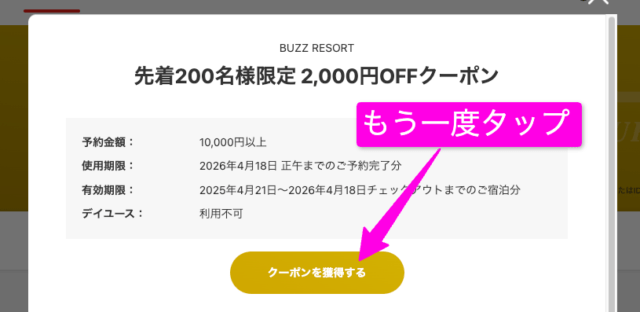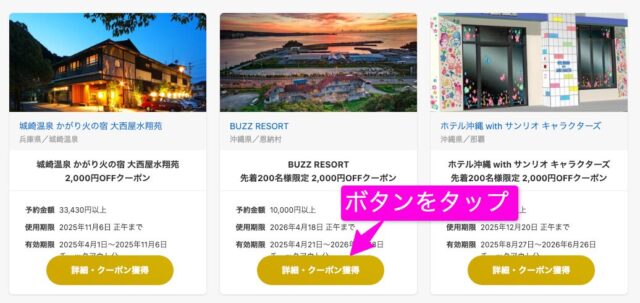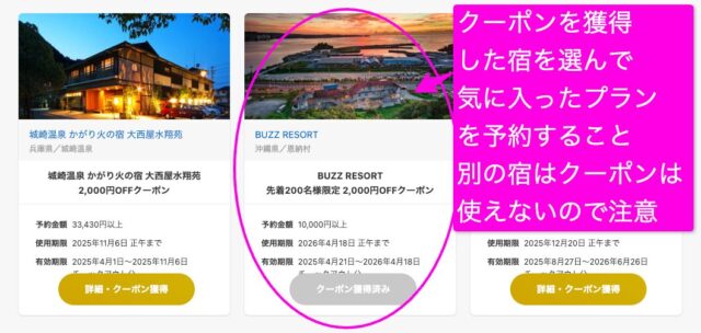クーポンは、予約画面でコードを入力するタイプだけでなく、事前に「クーポンを獲得する」ボタンを押しておく必要があるものがほとんどです。